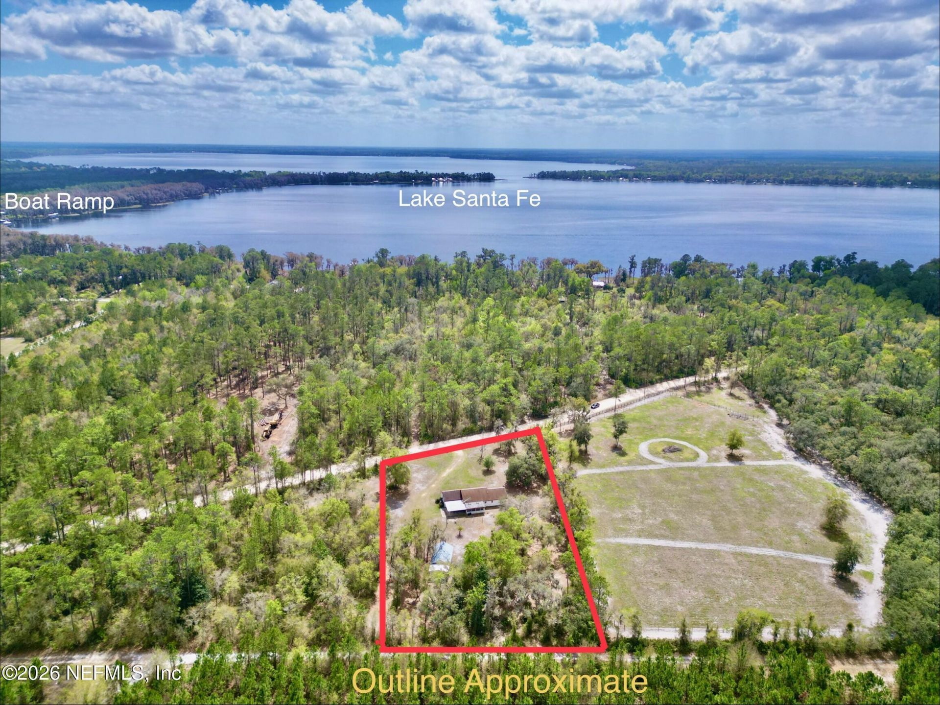Tucked away in the peaceful Lake Santa Fe community in Keystone Heights, 3-bedroom, 2-bath on 1.49 acres, includes 6000SF Bradford Co abandonment of 60Ft right-of-way in rear. Built in 1991 and thoughtfully maintained over the years, the home tells a story of care and reliability--from its dependable well water system to its sand mound septic system, pump replaced in Jan 2020. The HVAC replaced in Sept 2013. Roof also redone in 2013, a newer hot water tank, Electrical Wiring in conduit, visible in the attic. Surge Blaster installed in Meter by Clay Electric. The property expands beyond expectations, survey available and clearly marked boundary. A rear garage/shop addition completed in 2020 for hobbies or storage, main house features warm wood kitchen cabinets and brick veneer over solid block construction. Less than 10 minutes from Historic Melrose and 25 Minutes to Gainesville. Around the corner from the Boat Ramp, fishing, water sports and more. A place to create your own Paradise.